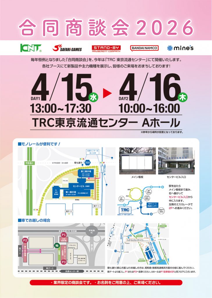 各社の最新アミューズメント機器を一堂にご覧いただける機会となっております。